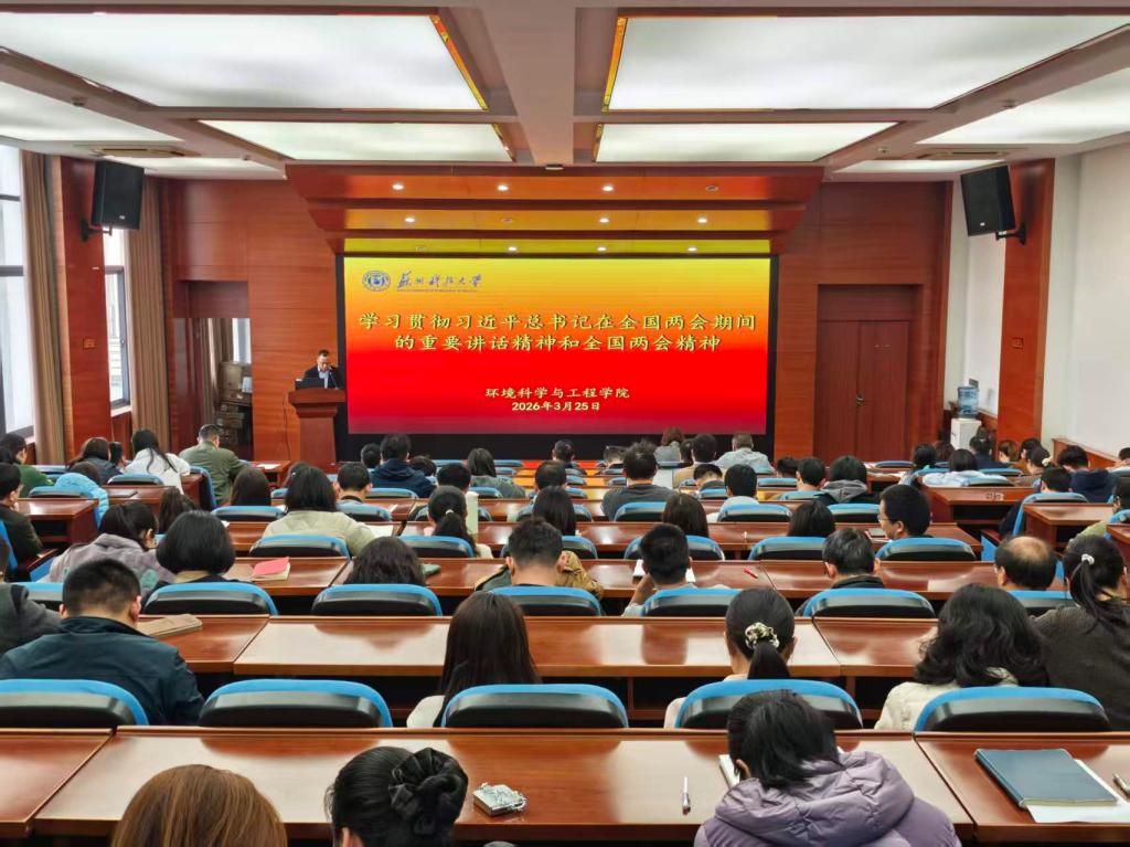 潘杨介绍了全国两会的核心要义,带领全体教职工共同学习了习近平总书记参加十四届全国人大四次会议江苏代表团审议时的重要讲话,传达了省委书记信长星在全省传达学习贯彻全国两会精神会议上的部署要求。潘杨强调,要强化政治引领,聚焦主责主业,强化责任担当,结合学院环境学科特色与发展实际,进一步推动党建与教学、科研、社会服务深度融合。